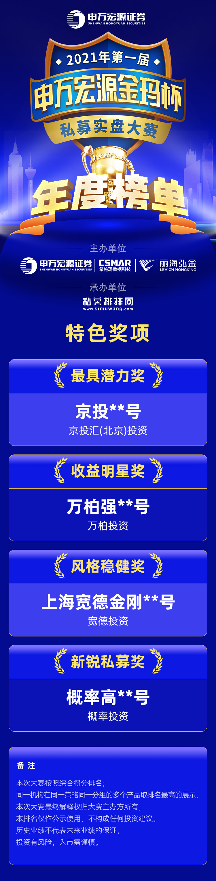 此外,申万宏源金玛杯私募大赛还特设最具潜力奖、收益明星奖、风格稳健奖、新锐私募奖等4个年度特色奖项,获此殊荣的私募基金分别是“京投**号”、“万柏强**号”、“上海宽德金刚**号”、“概率高**号”,由京投汇(北京)投资、万柏投资、宽德投资、概率投资担任管理人。