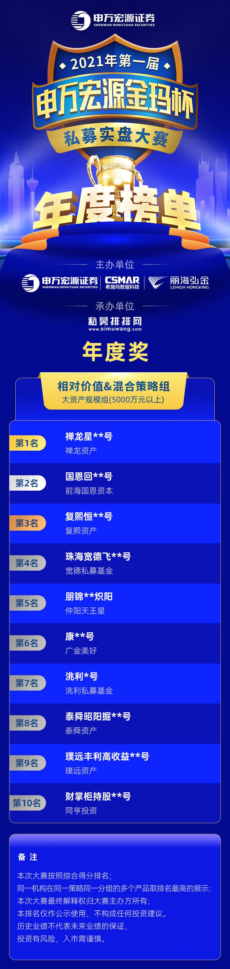本次大赛的年度奖项、特色奖项是根据大赛公示的定量和定性规则,按照综合得分进行排名,该排名主要是对管理人在大赛期间内的表现进行展示,不代表本公司对私募管理人和私募产品的推介。