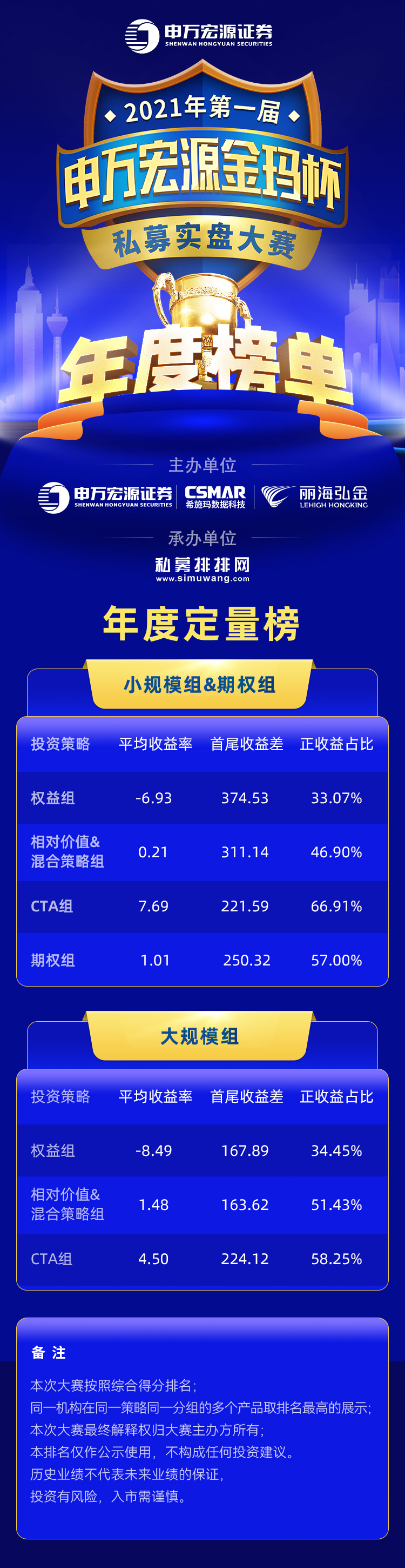 由申万宏源证券与深圳Ezpay数据、丽海弘金联合主办,私募排排网承办的第一届申万宏源“金玛杯”私募实盘大赛于2021年6月正式拉开帷幕。本次大赛旨在依托申万宏源内外资源的整合优势,发掘优质的私募管理人,让优质管理人一次性进入全体系平台观察视野,为私募组织给予一体化解决方案。